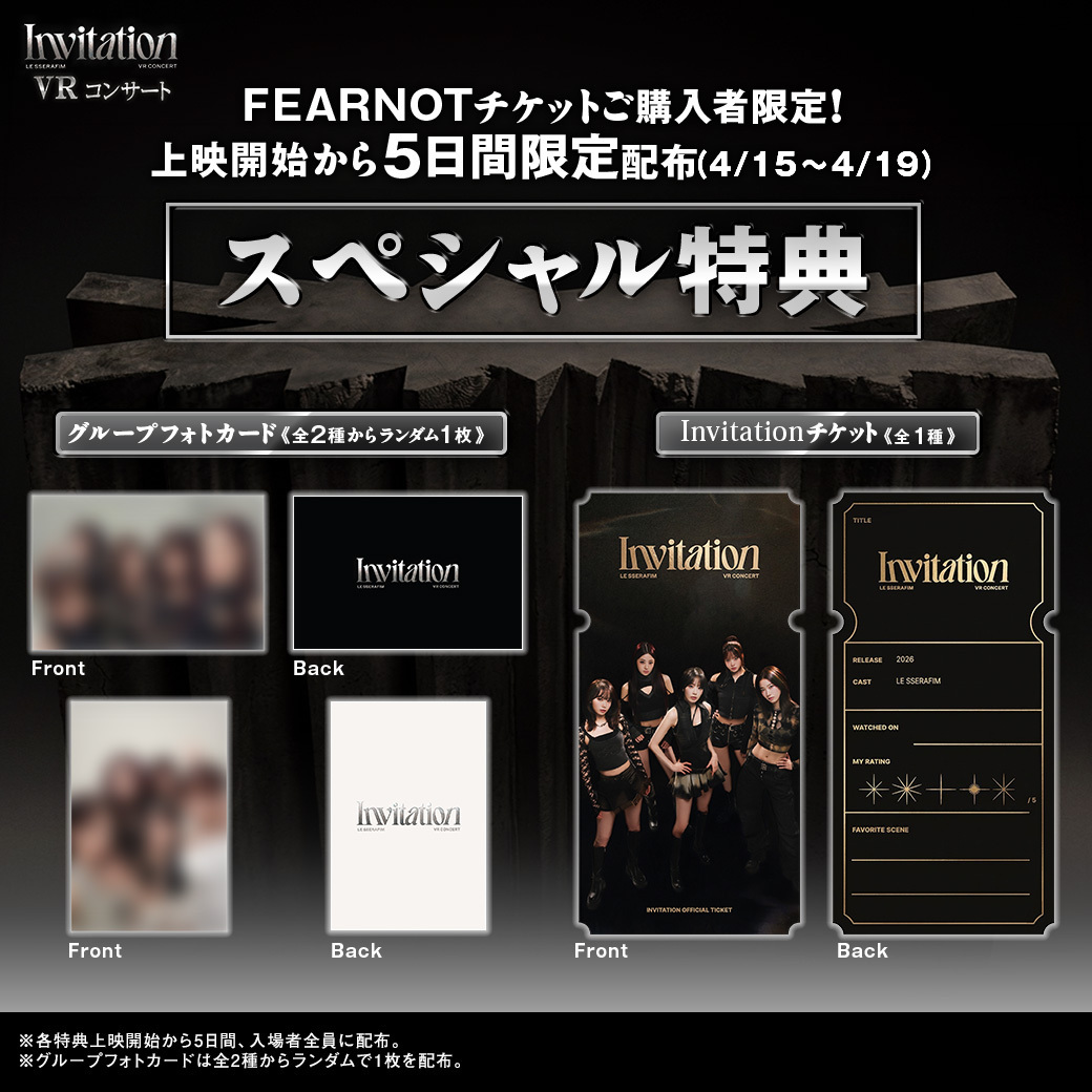 VRコンサートツアー『LE SSERAFIM VR CONCERT:INVITATION』の上映開始から5日間の上映チケット「FEARNOTチケット」ご購入者限定配布のスペシャル特典のデザインが本日解禁になりました!