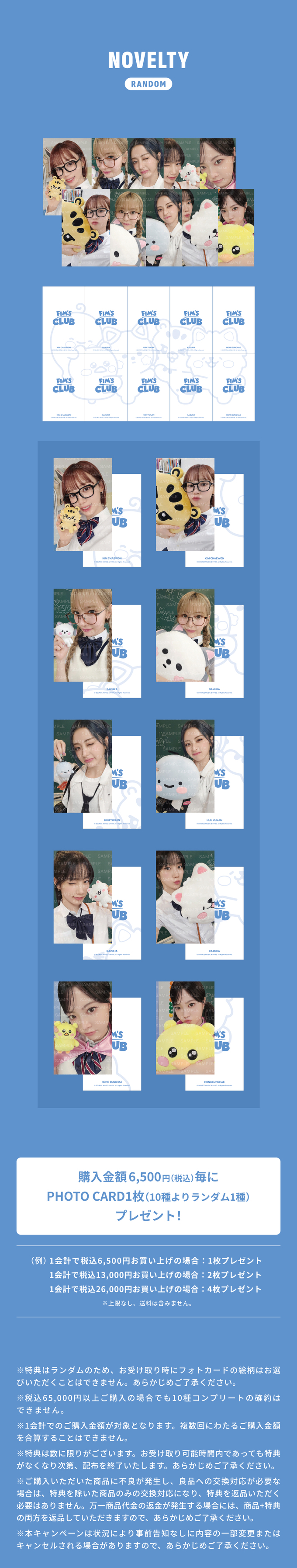 LE SSERAFIM FIM’S CLUB Merch.を1回のご購入6,500円(税込)お買い上げごとに、特典としてフォトカード(全10種よりランダム)をプレゼントいたします!