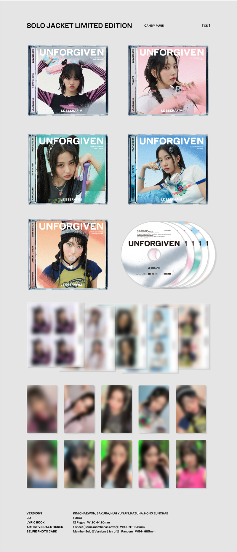 品番:UPCH-89542 (KIM CHAEWON)、UPCH-89543 (SAKURA)、UPCH-89544 (HUH YUNJIN)、UPCH-89545 (KAZUHA)、UPCH-89546 (HONG EUNCHAE)