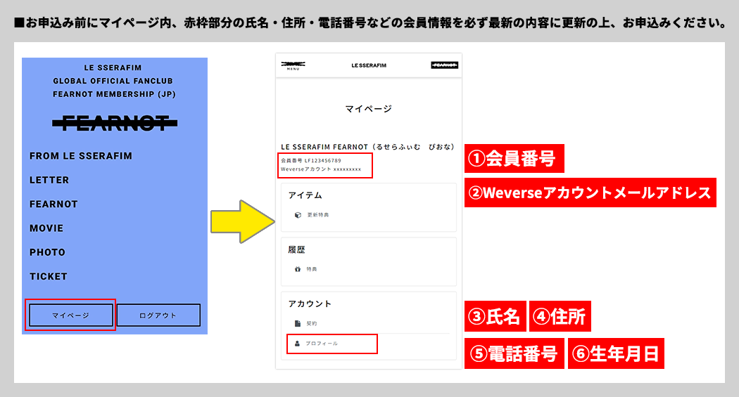 「会員番号(LFを除く数字9桁)」、「Weverseアカウントのメールアドレス」、「氏名(フリガナ)」、「住所(都道府県)」、「電話番号」、「生年月日」